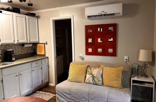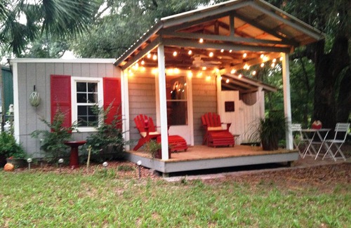 Enjoy 1.5 acres of spring front property with majestic live oak trees, a canoe & 2 kayaks as well as a dock, and fire pit. The cottage itself is a tiny 256 sq. ft. under air but includes big amenities like a separate bedroom with a queen size bed, cozy electric fireplace, a full inside bath with corner shower. There is a cute little dining table for two and everything you need to cook with is included. There is a full size refrigerator, microwave, two burner hotplate, electric skillet and griddle, large crock pot, blender and a toaster/oven large enough to bake a cake. Outside, there is a private outdoor shower stall for showering or rinsing off after a long day of outdoor activities, and you can watch the sun go down while enjoying a glass of wine sitting in the Adirondack chairs on the covered porch at the end of the day.