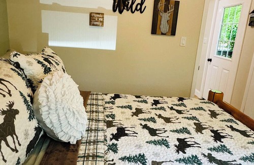 Relax on the porch in the rocking chairs, sipping your coffee and soaking in the total outdoor bliss. The bedroom and living room both have TVs, and The Lodge is equipped with full Wi-Fi for your convenience. Outside, enjoy the tranquility of nature with a private fire pit, ideal for relaxing evenings under the stars.