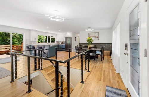 Nestled in SW Portland, this delightful house boasts 3 bedrooms - one with a king bed, one with a queen bed, and one with two twin beds. With an office for private meetings, and 2 living rooms, guests will feel right at home. The upstairs living room offers additional space with a cozy sofa bed for extra comfort. Down the hall, guests will find the upstairs bathroom with a separate tub and shower. Downstairs, guests will find the second living room, a laundry area, and a remodeled master suite. Open up the back door, and guests find the hot tub and a sprawling backyard filled with things to explore. This beautiful property also features amenities like a washing machine, dryer, ironing supplies, AC, heating, and WiFi. It's easy to see why you'll be able to unwind at our place.