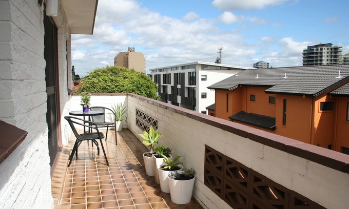 Quiet rear of block position. Listen to the birds chirp in the tree across the lane. The occasional Rainbow Lorikeet may visit the balcony.