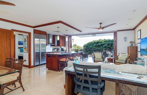 Stunning ocean and mountain views await you every day as you sit on the lanai. Beautiful 8' tall sliding glass doors slide into the walls, creating a seamless transition between indoor and outdoor living to show off the expansive lanai, adding an additional 235 square feet of living space.