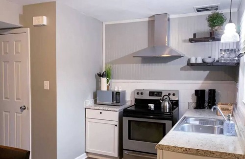 A cozy living room, half bath and fully equipped kitchen are located on the first floor. Kitchen features full sized appliances, cookware, utensils and dishware for four. Begin your morning with a cup of tea or coffee while sitting at a counter height table with seating for four. Living room is furnished with modern seating, flat screen TV and a designated workspace. Access to Sling TV, Hulu, Disney+ and high speed Internet included. A small, private patio is located just outside the back door.