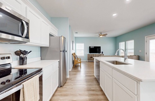 The well-equipped, island kitchen boasts modern stainless steel appliances, making meal prep a breeze. Whether you're cooking up a feast for the family or simply reheating leftovers, you'll find everything you need right at your fingertips. Gather together at the kitchen island or the nearby table for four for mealtimes or family game nights!