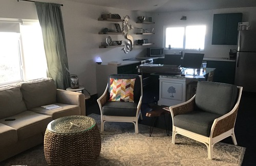 2 bedroom 1 bath open living and kitchen with beautiful floating shelves and great views of the ocean. 30 steps away from beach access. Where you can enjoy fishing, surfing, swimming or simply relaxing on the deck or sand. Storage space inside for bikes, boards, poles etc.
