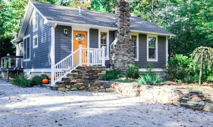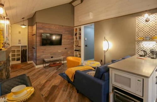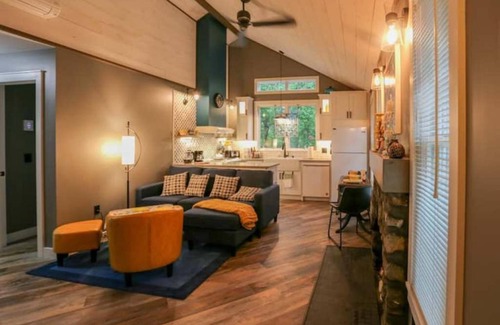 This brand new cozy 730sf cottage with extra-large windows offers cathedral ceilings; custom built-ins; fully equipped kitchen with quartz counter top which opens to cozy living area with gas fireplace, pull out queen size couch; two bedrooms with comfortable queen size beds in each, luxurious bathroom with a full size soaking tub and spacious shower with glass wall and door; stack-able washer/dryer; two large Smart TVs, split a/c units in each room, ceiling fan in the living room/kitchen; handmade custom stained glass panels and artwork add character to this wonderful place.