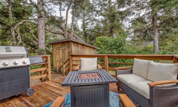 This newly updated Manzanita charmer is a great choice for two couple or family looking for a beach getaway. The spacious living room has a wood fireplace, TV/DVD and new modern furnishings. A separate dining room and sunny, fully equipped kitchen give you options for eating in, or you can “eat out” on the patio table on the deck outside, or even better breathe in the fresh evening air while you roast marshmallows around the fire table. The roomy bedrooms upstairs have their own balconies and large mirrored closet doors to let in the coastal light—and both have ocean views! You’re perfectly situated a block to the beach and near loads of hiking and biking at Nehalem Bay State Park. Downtown Manzanita, with its engaging shops and restaurants, is an easy walk, and you’re close to the golf course as well. You’ll love this cheerful, well-equipped cottage in the perfect location for a relaxing stay at the beach!