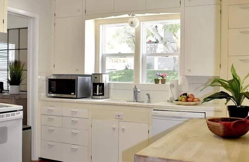 Newly designed and stylized, the property consists of a sun-filled formal living room, a separate dining room, a kitchen, two bedrooms, and an updated bathroom with double vanity, tub and shower. The rooms are appointed with high-end designer furnishings, orthopedic mattresses, and tasteful appointments to make your stay a pleasant one. There is also a serene fully fenced back yard oasis prefect for your furry friends. It includes an enjoyable backyard oasis w hot tub and gazebo. Additional features include hardwood floors throughout, central air conditioning, garage and driveway parking, laundry room, Samsung Ultra HD 75" TV, and fast and stable fiber based internet great for work-from-home professionals.