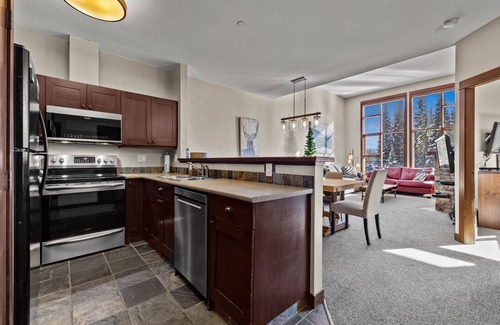 This 2 bedroom multi level condo in Stone's Throw has a view of Mt. Morrisey and easy ski-in/ski-out access to the Morrisey and Orient Express Chairlifts. It features a full kitchen, 2 baths, TV/ DVD, complimentary Wireless Internet Access, gas fireplace, washer/dryer, BBQ, private hot tub on the balcony and underground parking. The dining room table seats 6 people and the breakfast bar comes with 3 stools. This condo is 1000 sq.ft. It sleeps a maximum of 6 people. No smoking. No pets.