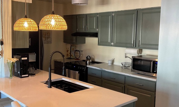 Still Waters is a one bedroom, with a queen size bed overlooking the veranda at the back of the building. It has one bath with a tub/shower combo. Full kitchen with a coffee bar. It has a spacious living room with Lake Superior views.