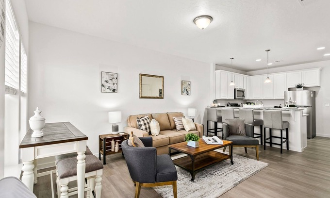 Stay in style in Boise! This modern 2BR/2.5BA townhome (built 2020) is centrally located near Boise Towne Square and The Village at Meridian, with Starbucks and Dutch Bros right outside your door. Enjoy an open-concept living area, granite kitchen with stainless steel appliances, and private in-home laundry. Upstairs you’ll find 2 master suites with brand-new beds and luxury linens. Perfect for families, couples, or groups—we also own the two next-door townhomes for larger stays!