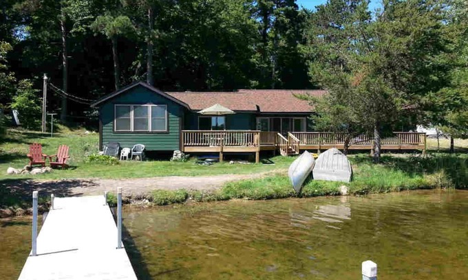 The cabin is 27 feet from the lake which offers great bass and northern fishing, water skiing, jet skiing or just taking in a sunset. The property has a deck with a grill and patio furniture. The swimming beach has a hard, sandy bottom and is shallow a long ways out. Perfect for little ones! There is also a private dock which you can use to park a boat. A fire pit is located on the beach as well.