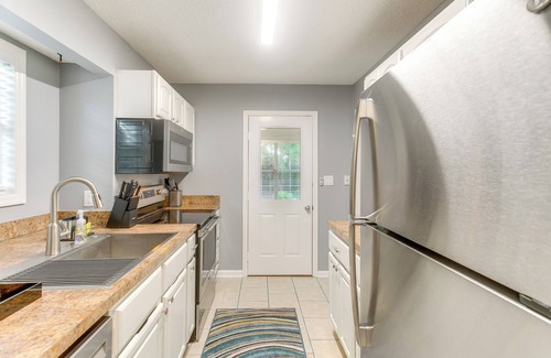 Unplug and reenergize at ‘Tranquility Place,’ an inviting 1-bedroom, 1-bath condo on St. Simons Island. Nestled within Island Square Condominiums, this vacation rental features a community pool and fitness center. Spend your days basking in the sun at Massengale Park and East Beach or discovering the quaint seaside town of Jekyll Island. Afterward, relax and relish the treetop views in the sunroom, or enjoy a movie night in the living room with your favorite person — it’s just the right size!