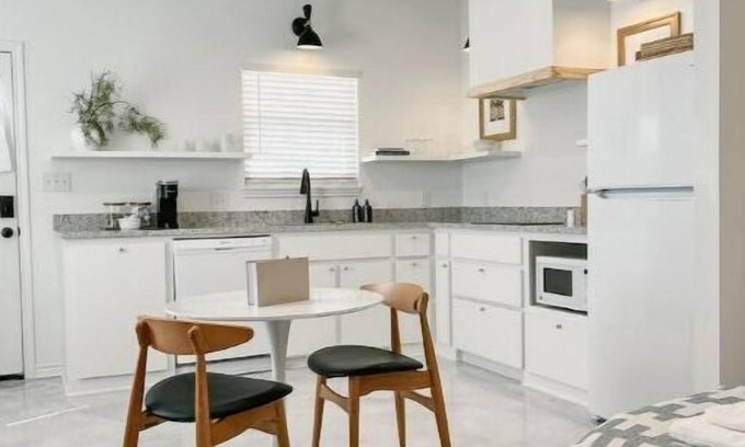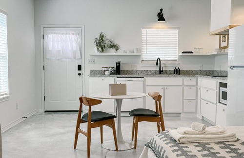 Professionally designed, the space features polished concrete floors, a queen-sized bed, a modern kitchen with stovetop and complimentary coffee, a dining table, fast wifi, a 40" TV, loveseat, private back patio, and a sleek bathroom.