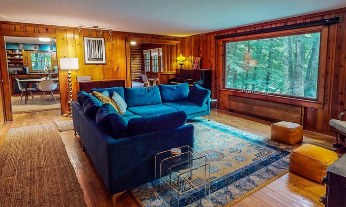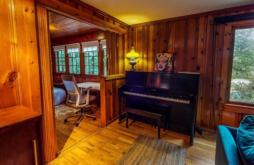 The cabin has a large master bedroom and a second sunroom with queen-sized couch/bed. The space is great for work-from-home (with two sitting/standing Branch desks) or relaxing in a comfortable lounge that has a huge projector screen and fireplace for those chillier evenings. The Roundout has a fully equipped dine-in kitchen, outdoor grill, and a stone hearth/BBQ in the garden.