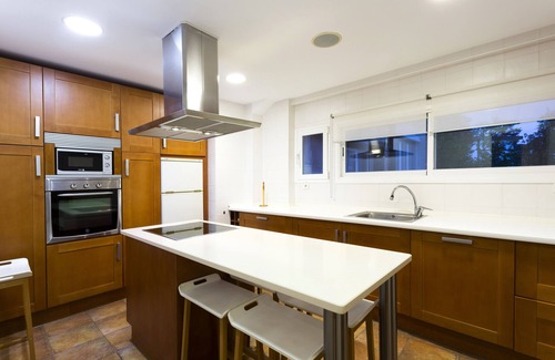 Fully exterior kitchen with central island for cooking and space to eat with 4 stools. Fully equipped with coffee machine, kitchen utensils, cutlery, dishwasher, washing machine, oven, vitro, toaster....