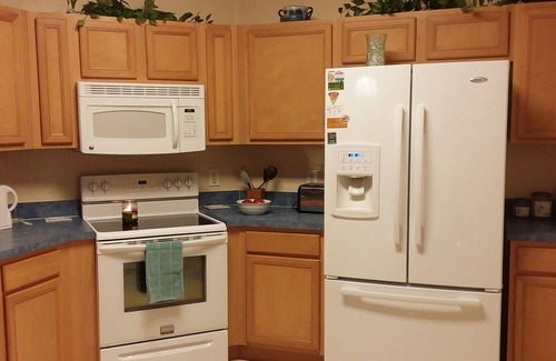 Kitchen comes fully equipped with all amenities needed for your vacation stay including dishwasher, toaster, blender for drinks, toaster, oven, stove, microwave, coffee maker and all cookware/utensils needed.