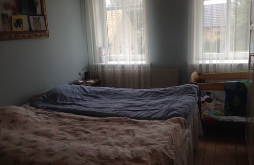 Vi udlejer værelser i vores tre-etages hus under Tønder Festivallen i år. Soveværelset her ligger på 1. sal og har en dobbeltseng (sat sammen af to elevationssenge, hver 90 cm. brede), der er 2 fællesbadeværelser i huset (et på samme sal som soveværelset og et i stueetagen), vi serverer en stor morgenmad, I kan frit bruge haven og køkken, hvis I skal have kaffe el. lign. samt opholdsstuen med TV på stueetagen. Der er trådløst netværk i hele huset.