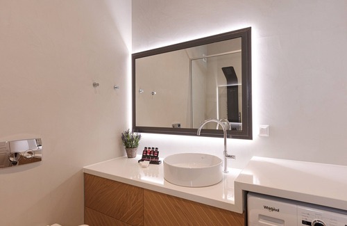 In the center of the building, there is a spacious open plan kitchen-dining-living room, which is illuminated by a glass skylight. In this room, there is a sofa that becomes a single or a double bed, as well as everything you need to try your art in Mediterranean cuisine. The apartment has two bathrooms with shower, one of which with hydromassage.
