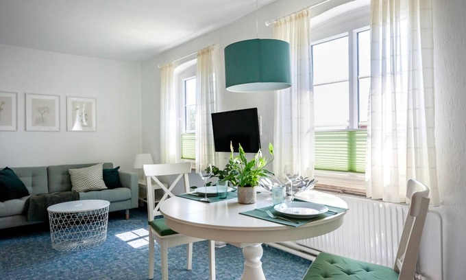 The apartment, furnished in fresh and bright colors, invites you to linger and relax. In the kitchen, it is wonderful to cook together and then enjoy the large dining table together. A small selection of real fehmarn and North German cookbooks offers the opportunity to try something new or just browse. From the window you can not only overlook a part of the well-tended farmer garden, but also over the surrounding fields to the Fehmarnsund. Get to know this apartment, we look forward to seeing you.