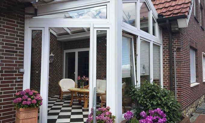 It has a large living room, two separate bedrooms (1 x double bed, 2 x single beds), one bedroom also has a flat-screen TV. A bathroom with walk-in shower and a large conservatory. The Non smoking apartment has its own entrance and is located on the ground floor. It is located in a quiet settlement near the holiday center Castle Dankern (distance 600 m) and the golf course Düneburg (500 m). An attractive children's playground is 100 meters away.