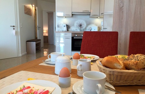 The 60 m² 3-room apartment with a spacious south-west balcony on the 1st OG is characterized by a maritime flair that invites you to enjoy and relax. High-quality granite flooring, underfloor heating in all rooms and the modern furnishings from 2014 as well as the sunny window front round off this style harmoniously.