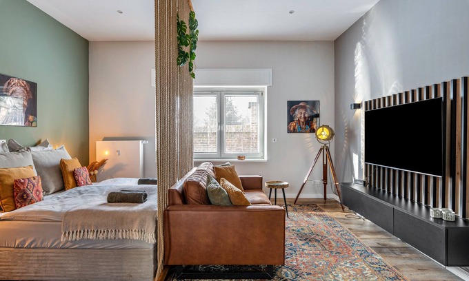 The living/bedroom with a large double bed ensures a restful night's sleep. Here you will also find storage space for your clothes. The cozy couch corner with 55-inch TV is a wonderful place to relax.