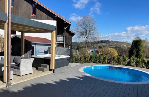 Vacation home (210 sqm) for up to 9 people with small, fenced garden and beautiful covered terrace is located in Freyung. Vacation home (210 sqm) for up to 9 people with small, fenced garden and beautiful covered terrace provides accommodation, featuring Kitchen, Laundry, Pool, among other amenities. This Apartment features Kitchen, Laundry, Pool, to make your stay a comfortable one.