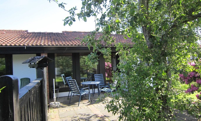 Our cozy, single-storey semi-detached house 79, of the type Scout 42, offers you a living / usable area of approx. 42 m² and can be occupied by 2 persons (ground level) or up to 4 persons when using the bunk under the roof. In addition, a cot for a toddler can be placed in the bedroom. The house offers you a bathroom (shower / WC), an internal storage room with steep stairs in the bunk, 1 bedroom with two single beds and the living room with adjoining kitchen (ceramic hob / oven, fridge / freezer, dishwasher) with dining area. Access to the furnished terrace from the living room. In the bunk are 2 more sleeping accommodations (ideally for 2 children from 6 years). Non smoking house - free Wi-Fi - Pets not allowed - bread service from Easter to October!