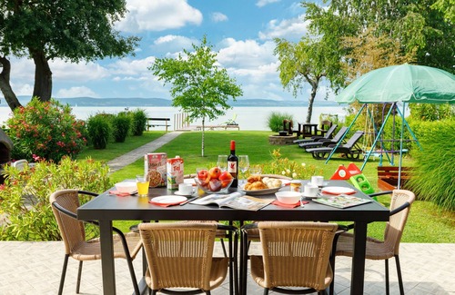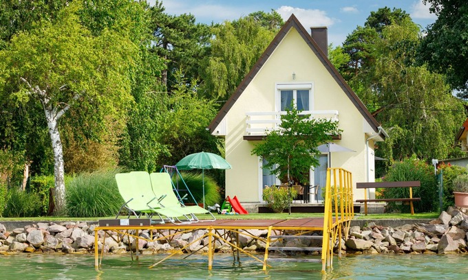 Balatonlelle 36 km from Siófok: Comfortable house "Hanna". In a quiet, sunny position, 20 m from the lake, direct access to the beach, in a cul-de-sac. Private: beautiful garden to relax. Outdoor shower, barbecue (swing, sandbox). In the house: WiFi, air conditioning. Grocery 500 m, supermarket 4 km, restaurant, bicycle rental 3 km, thermal baths "Csisztapuszta" 31 km. Tennis 4 km, riding stable 6 km, cycle lane 100 m, children's playground 1 km. Nearby attractions: Siófok Giant Wheels 36 km, Kereki Dinosaur Park 23 km, Adventure Park Zamárdi 28 km, Bella Zoo Siófok 45 km, Bebo Aquapark 38 km, Szántód Ferry 21 km. Please note: railway line 100 m from the property. Swimming right in front of the property, including a landing stage.