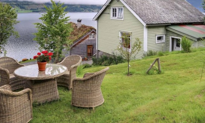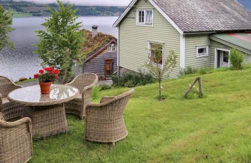 "Jølstrablikk (FJS096)", 4-room house 100 m2 on 2 levels. Partly with sloping ceilings, antique and cosy furnishings: living/dining room with Scandinavian wood stove, dining table, TV and DVD. 1 room with 1 double bed. Kitchen (4 hot plates, oven, dishwasher, toaster, kettle, microwave, freezer) with dining table. Shower/WC. Upper floor: 1 room with sloping ceilings with 1 double bed. 1 room with sloping ceilings with 1 bed (75 cm). Electric heating, underfloor heating. Patio. Terrace furniture, barbecue (portable). Very beautiful view of the lake. Facilities: washing machine. Internet (WiFi, free). Please note: non-smoking house. Maximum 2 pets/ dogs allowed. Smoke alarm, fire extinguisher. Freezer approx. 400 l at the owner's place next door. 924531169