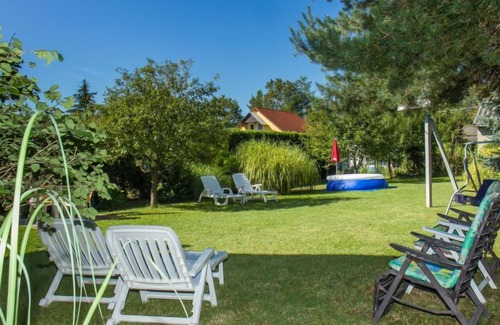 Balatonkeresztúr: Cosy single-family house "Maggio", 2 storeys. In the resort, in a quiet position, 800 m from the lake. Private: beautiful, well-kept garden 600 m2 (fenced), lawn for sunbathing, swimming pool (above ground) (seasonal availability: 15.May. - 15.Sep.). Basketball. In the house: air conditioning (extra). Grocery 800 m, restaurant 150 m, grass beach 800 m.
