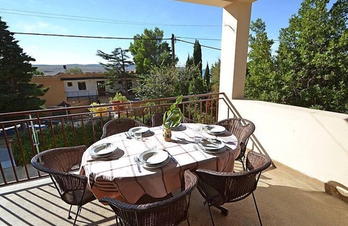 4-room house 100 m2 on 1st floor, south facing position. Living/dining room 25 m2 with satellite TV (flat screen), air conditioning. Exit to the terrace. 1 room with 1 double bed (2 x 90 cm, length 200 cm). Exit to the terrace. 1 room with 1 bed (90 cm, length 200 cm), 1 french bed (160 cm, length 200 cm), air conditioning. 1 room with 2 beds (90 cm, length 200 cm). Open kitchen (4 hot plates, oven, dishwasher, freezer, electric coffee machine). 2 showers/WC. No heating option. Terrace 8 m2, roofed, south facing position. Terrace furniture, deck chairs. Partial view of the sea. Facilities: children's high chair, baby cot. Internet (WiFi, free).