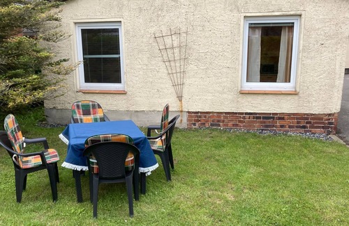 The house is simply furnished with a living room with sofa, table, radio + TV, kitchen with dining table, coffee maker, toaster and dishes, 2 bedrooms with a double bed and two single beds, bathroom with shower and toilet, private parking space on the property, seat There are also outdoor lounging areas. Barbecue possible. Bed linen is delivered from 4 nights.