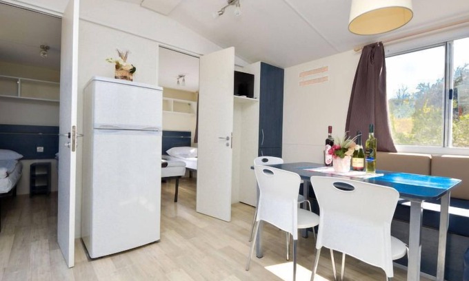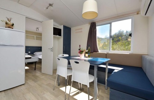 4-room mobile home 32 m2, west facing position. Living/dining room with satellite TV (flat screen), air conditioning. Exit to the terrace. 1 room with 1 french bed (140 cm, length 190 cm). 2 rooms, each room with 2 beds (70 cm, length 190 cm). Open kitchen (4 hot plates, freezer). Shower/WC. No heating option. Terrace 14 m2 partly roofed. Terrace furniture. View of the sea. Facilities: washing machine, hair dryer. Internet (WiFi, free).