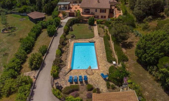 Large, cosy villa "Paradiso", surrounded by trees and fields. 5.5 km from the centre of San Pasquale, 17 km from the centre of Santa Teresa di Gallura, in a quiet position on a slope, 6.5 km from the sea, in the countryside. Private: property 1 ha (fenced), well-kept garden with lawn and trees, swimming pool fenced (6 x 12 m, depth 140 cm, seasonal availability: 01.May. - 16.Oct.). Outdoor shower. Motor access to the house. Stepped path to the house. Parking, single garage. Supermarket 6 km, restaurant 6 km, bar 6 km, sandy beach "Porto Pollo" 15 km. Marina 7 km, surf school 7 km, sailing school 7 km. Nearby attractions: Porto Pozzo 6.5 km, Palau 17 km, Arcipelago di La Maddalena 23 km, Porto Cervo 40 km. Please note: car recommended.