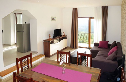 "Stella", 6-room semi-detached house 145 m2 on 2 levels. Living/dining room with satellite TV and air conditioning. Exit to the balcony. 2 rooms, each room with 1 french bed (160 cm), shower/WC. 1 room with 1 french bed (160 cm), shower/WC. Exit to the balcony. Open kitchen (oven, dishwasher, 4 ceramic glass hob hotplates, electric coffee machine). Upper floor: living/dining room with sloping ceilings with satellite TV. 1 room with sloping ceilings with 1 french bed (160 cm). Exit to the terrace. Open kitchen (4 hot plates, oven, freezer, electric coffee machine). Bath/WC. Electric heating, air-conditioning. 2 balconies. Balcony furniture, deck chairs. Beautiful panoramic view of the countryside. Facilities: baby cot. Internet (WiFi, free). Please note: non-smoking house. When there are less than the maximum number of guests staying at the property, one floor will not be available for use.