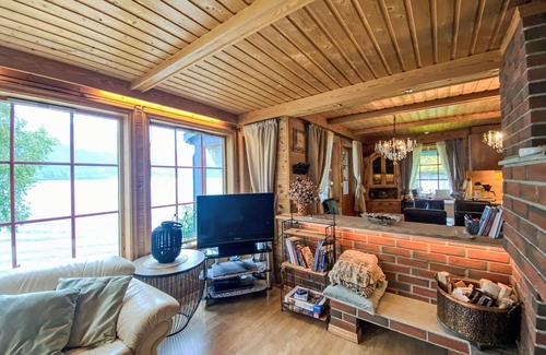 "Strand", 5-room house 120 m2 on 3 levels. Living room with winter garden with TV. 1 room with 1 double beds. Open kitchen (oven, dishwasher, 4 ceramic glass hob hotplates, microwave, freezer, electric coffee machine) with dining table. Shower/WC. Heating. On the lower ground floor: 1 room with 2 beds. Sauna. Heating. Upper floor: 1 open room with 1 double beds. Sep. WC. Heating. Wooden floors. View of the lake. Facilities: washing machine, sauna, iron. Internet (WiFi, free). Please note: non-smoking house. 924531169