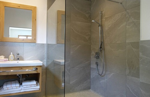 On the second floor, six further bedrooms offer space for our guests. Three of the rooms are equipped with a double bed, washbasin, shower and WC, while the other three each offer a double bed, a single bed and a private bathroom. The balcony on the second floor spoils you with a breathtaking panoramic view of the surrounding mountains and the Zillertal - the perfect place to enjoy the view of the Zillertal Arena and Mayrhofen.