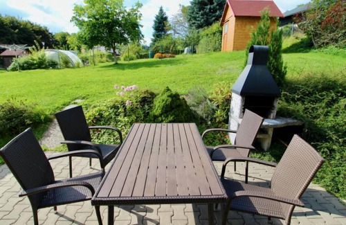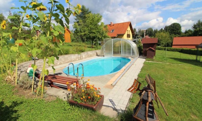 House "Zásada", 2 storeys, detached, built in 2008. On the outskirts, in a quiet, sunny position, 500 m from the skiing area. For shared use: swimming pool heated (6 x 3 m, depth 140 cm, seasonal availability: 01.May. - 30.Sep.). Private: property 900 m2, meadow. Badminton, terrace, garden furniture, barbecue. In the house: WiFi, storage room for bicycles, storage room for skis, washing machine. Motor access to the house. Parking (for 2 cars) at the house. Grocery, restaurant 100 m, bus stop 200 m. Slopes 500 m, ski school 500 m, cross country ski track 10 m, children's playground 300 m. Nearby attractions: Cyklostezka Járy Cimrmana, pivovar 200 m, rozhledna Špičák 12 km, Jizerka 20 km, Aquapark Babylon Liberec 23 km, Ještěd 34 km. Well-known ski regions can easily be reached: Tanvaldský Špičák 12 km, Harrachov 25 km, Rokytknice - Lysá Hora 25 km. Hiking paths: Černá Studnice (869 m) 6 km, Český ráj - Hrubá Skála 25 km, hrad Valdštejn 27 km. Please note: the pool is located behind the fence on the owner´s property, who uses the pool minimally and only in the absence of guests.