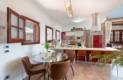 With a view of the mountain, the villa Mogaren Naturaleza y Relax in Vega de San Mateo is perfect for a relaxing holiday. The 3-storey property consists of a living room, a well-equipped kitchen, 5 bedrooms and 3 bathrooms and can therefore accommodate 14 people. Additional amenities include high-speed Wi-Fi (suitable for video calls) with a dedicated workspace for home office, a smart TV with streaming services, air conditioning, a washing machine, a dryer as well as children's books and toys. A baby cot and a high chair are also available. This vacation rental boasts a private outdoor space featuring a whirlpool, garden, open terrace, covered terrace, balcony, barbecue, and outdoor shower.