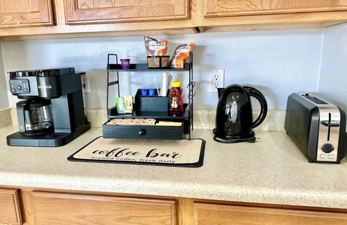 -Complimentary coffee (ground and pods), tea, sweeteners/honey & creamer.