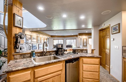 Inside, cozy up by one of the gas fireplaces or indulge in a luxurious soak in the jetted tub. With high ceilings and abundant natural light, the spacious interior blends classic cabin decor with rustic wood paneling and modern amenities. The main level features a huge eat-in kitchen, ideal for preparing meals to enjoy in the formal dining room. An ornate staircase leads to the lower level den, complete with multiple sitting areas and a bar, offering a cozy space to unwind.