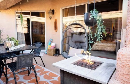 Contemporary Mid Century Modern. Huge Master suite with neon lights, chandeliers, a tub you'll Love. Immerse in the outside entertaining area with a hanging chair, lights, outside heaters, wind chimes, gas fire feature and waterfall alongside misters! Fun Faux Slots, heated spa, sparkling pool with a light show. Enjoy the TV and music in the pool. Lounge poolside in a backyard oasis. Inside there's a marble open shower. Gorgeous kitchen and dining space with TV in master bedroom and living room.