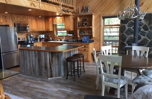 This cabin is a very well maintained 2 bedroom (enclosed den/office can act as an additional 3rd bedroom) lake home with quality furnishings and amenities. The very large loft bedroom upstairs has two comfortable queen size beds. If needed, there is a queen air mattress as well as a pack and play for an infant up to 2 years old. The main floor bedroom has a queen size bed. The couches in the den are comfortable and provide additional sleeping space if needed as the french doors can be closed to provide some privacy. On the main level there is one full bathroom with a shower/tub combination and an additional1/2 bath that includes toilet, sink basin/faucet, and washer/dryer.