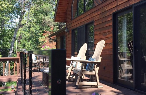 There are many amenities outside that are available for relaxation and enjoying the views. There is a patio table with 4 swing/rocking chairs and 2 “By The Yard” Adirondack glider rockers right on the main deck from the dining and living area. A second lower level deck has built-in wood seating around the perimeter of the deck as well as an addition patio table with 6 chairs. Two Adirondack chairs on the edge of the dock are available for enjoying the views and/or fishing as well as a bench. Two, 10 ft Pelican kayaks and a canoe are available for use. Renters need to provide their own life jackets. A large, fire pit with marble seating is located right out the side entrance door. A propane, gas grill is available in the area as well. A new path was built from the deck to the dock in the summer of 2021 for easy walking to the lake.