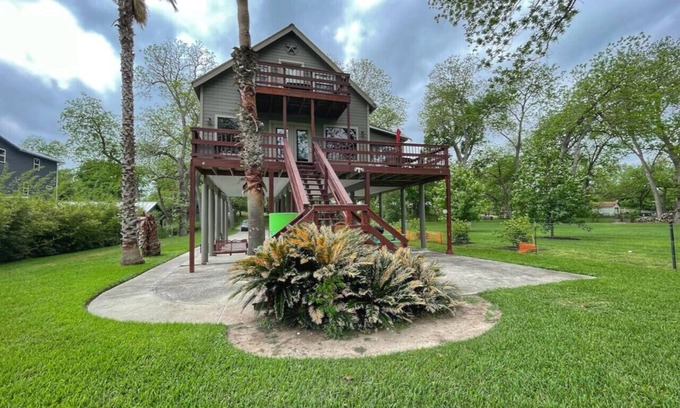 The F&RM House Welcome to the F&RM House, a charming and spacious two-story home offering 1,484 sq ft of comfort and tranquility. Nestled on nearly an acre of serene property, this retreat is perfect for those seeking privacy, relaxation, and a peaceful escape from the hustle and bustle. Secluded Entrance & Outdoor Space Arrive through a private gated entrance, where a long, winding driveway leads you to your hidden retreat, surrounded by lush trees. Beneath the house, you’ll find an open area for parking or additional shaded hangout space, perfect for escaping the sun on warm days. Step up 20 stairs to reach the main level front deck, where a cozy outdoor patio set for four invites you to enjoy your morning coffee or unwind with a late-night drink while overlooking the expansive front yard and the river beyond. Main Level Comforts Inside, the main level boasts an inviting living room equipped with a 55” smart TV, Blu-ray/DVD player, and plush seating for a relaxing movie night. The fully stocked kitchen features modern conveniences, including a Keurig coffee maker, making meal prep a breeze. Gather around the dining table for six and share memorable meals together. A bonus kids' room provides entertainment for younger guests, featuring a 50” smart TV, Blu-ray/DVD player, a connected dock for Nintendo Switch, and a Sega console with preloaded games. The room is also furnished with a kids' kitchen set, play table, and a comfy sofa sleeper for additional accommodations. The main-level bedroom offers a queen bed with an ultra-luxury pillow-top mattress, dual nightstands with USB-equipped lamps, ensuring convenience and comfort. The main-level bathroom includes a combination tub/shower and a stacked washer and dryer for added convenience. Upstairs Retreat Ascend the shallow staircase (watch your step!) to find two additional bedrooms. The first upstairs bedroom features a full-over-full bunk bed plus a twin daybed with a twin trundle, making it a fantastic space for kids or groups. The second upstairs bedroom is a private sanctuary with a queen bed (ultra-luxury pillow-top mattress), dual nightstands with USB-equipped lamps, a 50” smart TV, Blu-ray/DVD player, and a private balcony overlooking the beautiful yard. Expansive Outdoor Enjoyment The large, grassy yard is perfect for outdoor activities, whether you’re playing games, enjoying a picnic, or simply soaking in the natural beauty. A grill and picnic tables are available for outdoor dining, adding to the home’s inviting atmosphere. Enjoy the privacy, peace, and relaxation that F&RM House provides. Whether you’re looking to unwind in nature, spend quality time with loved ones, or simply escape into a secluded retreat, this home is the perfect getaway by the river. Book your stay today! There are no public boat ramps in this area and the water is shallow off this property. We strive to provide excellent customer service to all of our guests!