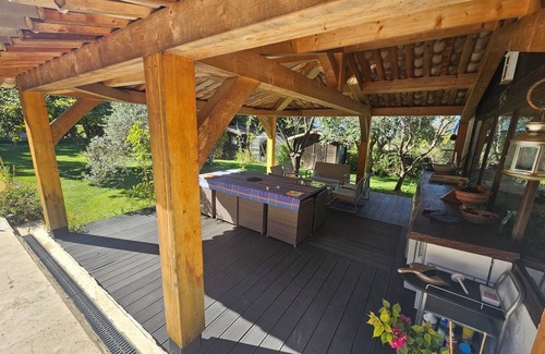 The summer kitchen is the place to live, located just in front of the swimming pool, composed of a table with 8-person armchairs. A lounge for 8 people.