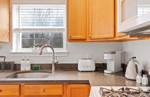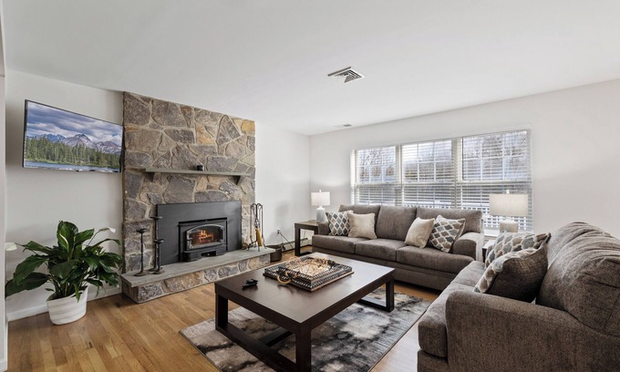 This cozy and comfortable 5 bedroom/ 2.5 bath home nestled in the woods is warm and inviting. With three levels, there’s always a place for some moments to unwind alone, but when it comes time for the whole group to come together, there’s loads of space for that too. Kick back inside or out. No matter the season, the patio with fire pit makes a great spot for conversation and star gazing.