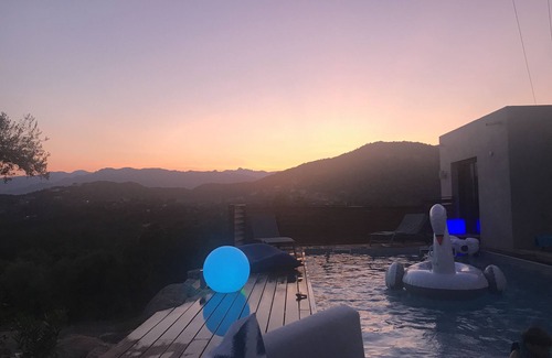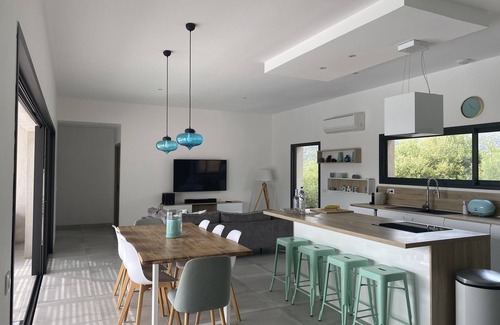 Located in the town of Cirendinu, a few minutes from the famous beach of Cabanon Bleu, beautiful villa of new architect (end of construction May 2019), air-conditioned, 4 bedrooms 10 people, with a beautiful mountain view and a sea view. generous bay windows offer a magnificent view from each room of the villa and give access to a large terrace with a heated pool (8m / 4) .En outside, you can enjoy a beautiful garden space harmoniously laid out in terraces. Located in the immediate vicinity of Porto-Vecchio (10km, 15 min by car), you will be able to appreciate magnificent white sand beaches among the most beautiful of Corsica: St-Cyprien, Palombaggia, santa-Giulia, the Ruscana, of the name of the the white island it faces but also the large bay of Pinarello (5 min by car) lined with a long and beautiful pine forest at the end of which points the famous wild island of Pinarellu. Athletes can practice a range of water activities such as kite surfing, paddle boarding, wake boarding, sailing or even rent a boat in Pinarello.