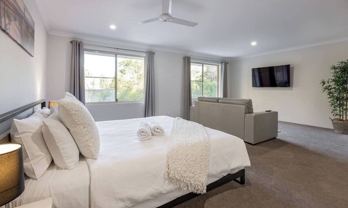 Situated within walking distance to the onsite tennis court and winery as well as a ten minute drive to the famous Smiths Beach and Dunsborough town. A perfect country escape! Ideally situated in amongst the natural bushland of the renowned Rivendell Winery Estate and Gardens, this contemporary holiday home provides plenty of space for your family and friends to relax & unwind with private bush and vinyard views. Four large bedrooms will sleep 8 adults comfortably in heavenly beds!
